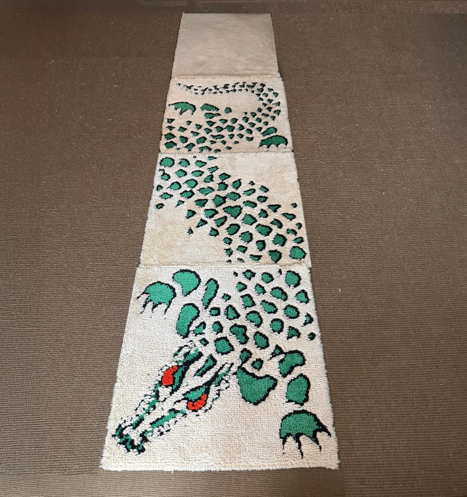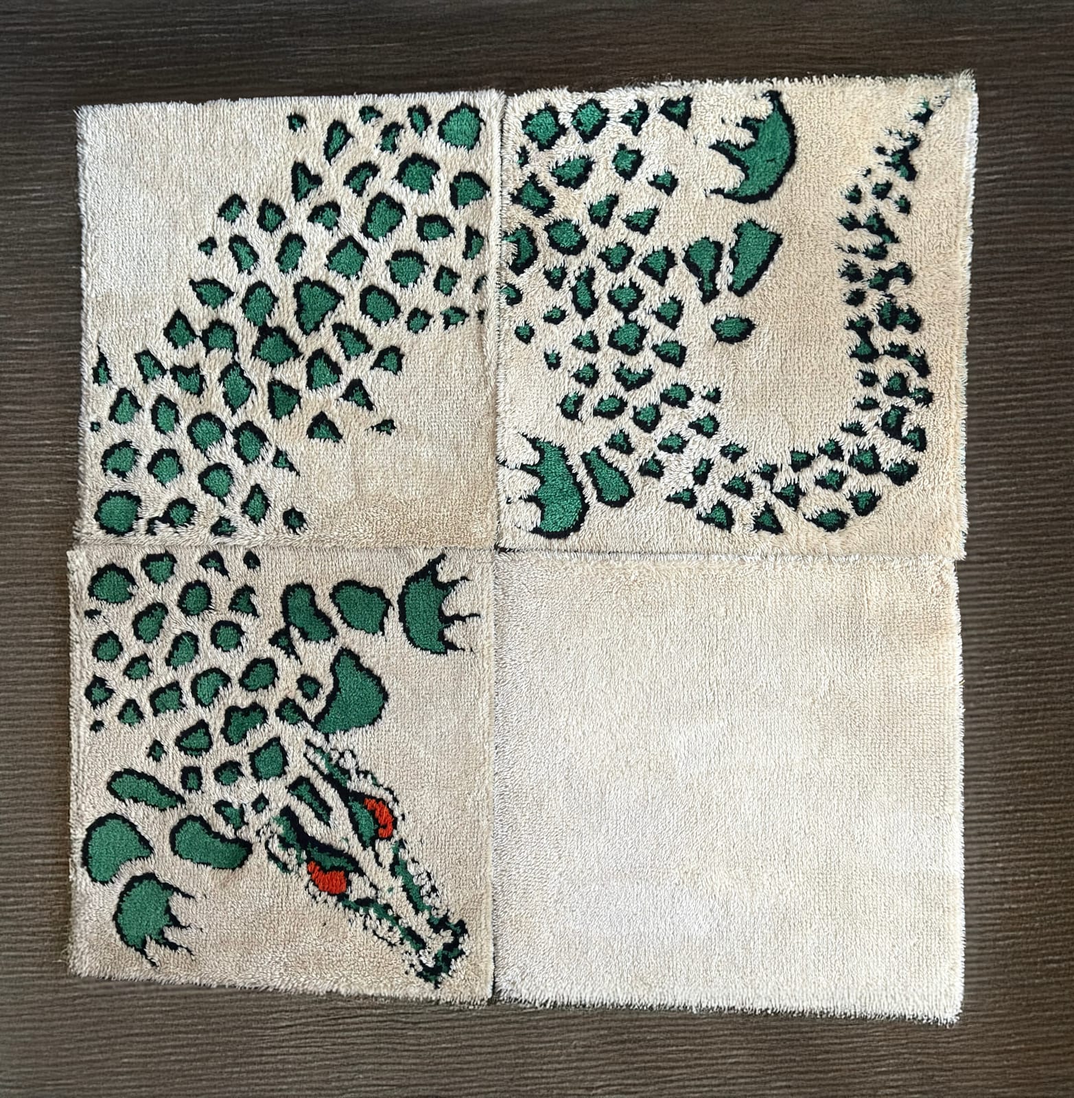 Hand-tufted wool, in four modular panels, each approximately 93 × 93 cm, forming a stylised dragon in shades of green and black on an ivory ground, with orange eye detail. The panels may be arranged as a square composition (186 × 186 cm), as a long runner (93 × 372 cm), or in other configurations, reflecting the original modular concept devised for the Olivetti residential interiors. Baring a label showing cleaned and restored by Nilufar, Milan c.2020.